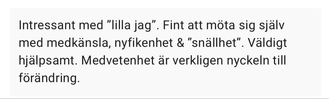 Identifiera triggers, âLilla Jagâ och dina mönster. Du medvetandegör de undermedvetna drivkrafter som hĂ„ller dig kvar i prestation, anpassning och otillrĂ€cklighet.âšDu börjar se dina mönster med empati istĂ€llet för sjĂ€lvkritik â första steget mot verklig förĂ€ndring.