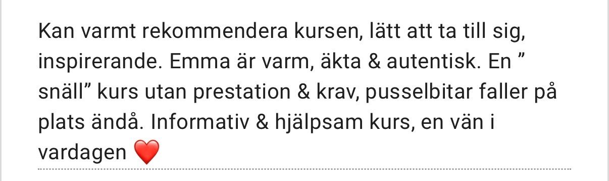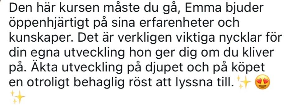 Svaret visade sig vara ja. Och det förĂ€ndrade allt. Det Ă€r frĂ„n den insikten â förkroppsligad, inte bara som en intellektuell förstĂ„else eller en emotionell upplevelse â som jag idag guidar andra. Allt jag delar i kursen Ă€r nĂ„got jag sjĂ€lv lever. Och nej, du behöver inte vara pĂ„ botten, gĂ„ igenom det jag gĂ„tt igenom eller pausa hela ditt liv under ett halvĂ„r. Det Ă€r dĂ€rför jag skapade det hĂ€r â för att du inte ska behöva det. Jag vill visa en annan vĂ€g.